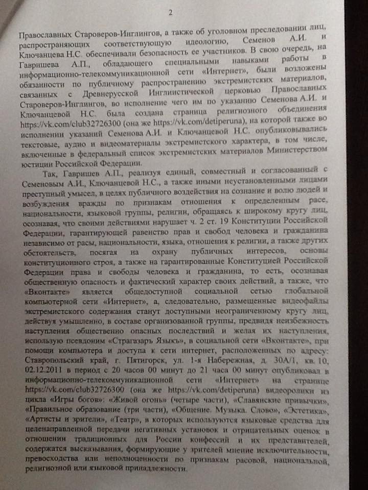 В постановлении о возбуждении уголовного дела в отношении Гавришева, Семенова и Ключанцевой, в частности, говорится, что они опубликовали ролики из документального цикла «Игры богов», в июне 2014 год признанного экстремистским: по замыслу авторов, этот фильм «раскрывает сущность древнеславянской культуры, обращает внимание русских людей на то, в каком мире мы сейчас живем и что нас окружает», снят «в жанре публицистики» на тему «исследования древней и современной славяно-арийской культуры». В чем конкретно обвиняются брат и сестра Литвиненко, ОВД-Инфо пока неизвестно.