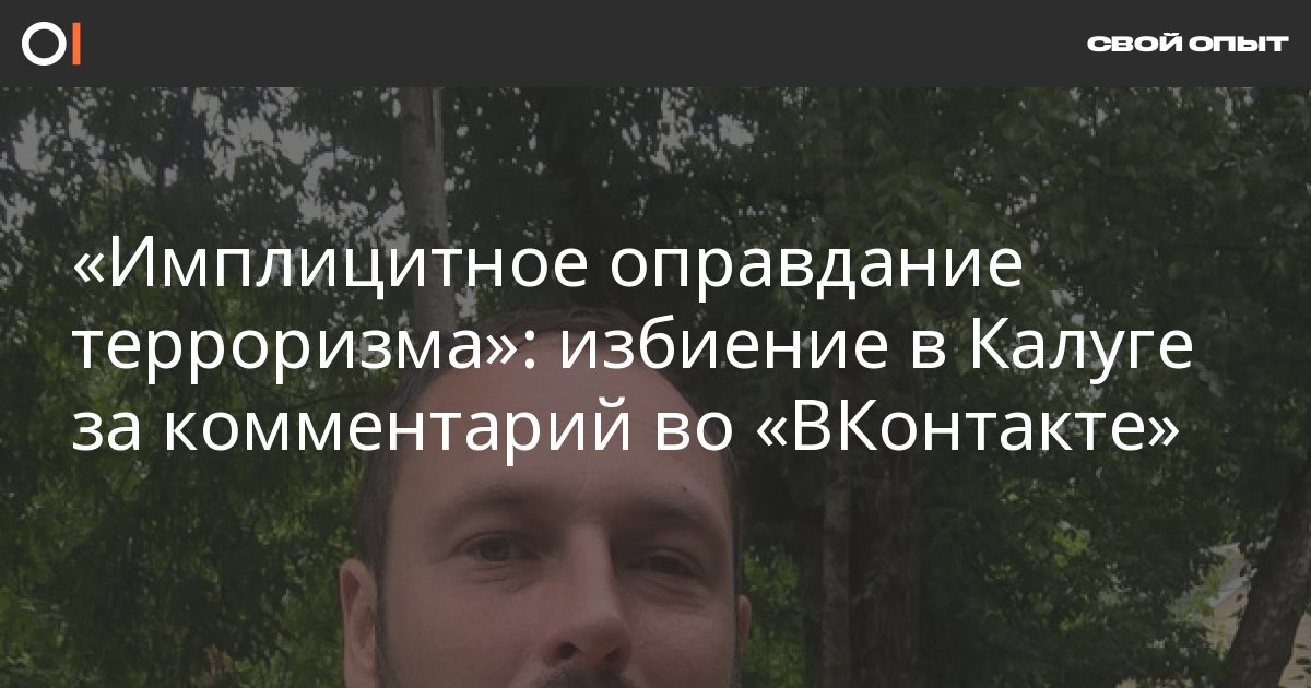 Житель Калуги Иван Любшин написал комментарий во «ВКонтакте», где назвал взорвавшего себя в ФСБ Михаила Жлобицкого «героем недели», подразумевая, что тот — «герой новостей». Позже Любшин удалил комментарий. Но спустя год на мужчину завели уголовное дело и избили при задержании. Он заявил об избиении, но жалобы ни к чему не привели. ОВД-Инфо поговорил с Любшиным.