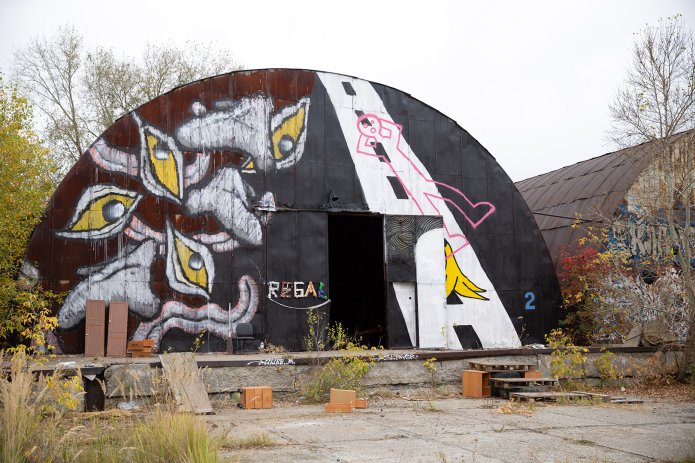 Выставка современного уличного искусства в рамках проекта ZABROSHKA и вечеринка после нее проходили на заброшенной территории Вокзального района. Это огромное пространство, где стоят пустые металлические ангары, бетонные коробки под склады и опустевшие деревянные дома. На один день эти помещения должны были занять художники.