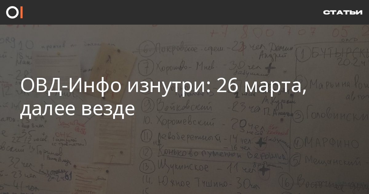 26 марта — важный для нас день, который, судя по всему, закончится совсем не скоро. ОВД-Инфо совершил множество ошибок, которые были проанализированы и, надеемся, исправлены. Мы уже многое изменили в своей работе и стали сильнее, но это только начало.