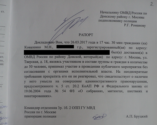 Спустя год после протестов и массовых задержаний 26 марта 2017 года и огромного количества судов, ОВД-Инфо публикует анализ некоторых полицейских материалов по задержаниям в Москве. Они показывают уровень правового нигилизма полицейских, их оформлявших. Рапорты составлялись «под копирку», на официальных бумагах присутствуют явные признаки подделки подписей.