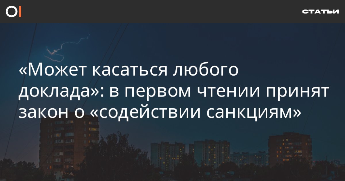 Насчет второй части законопроекта: важно, какие будут формулировки, когда его примут. Возможна широкая формулировка, возможна узкая. Узкая будет касаться тех, кто целенаправленно призывает к введению санкций, и вряд ли затронет многих.
