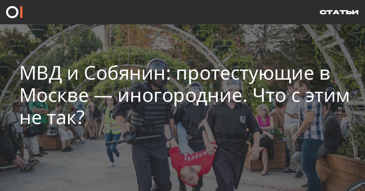 Власти утверждают, что более половины участников акции 27 июля — иногородние. Этот тезис начали продвигать сразу после акции. «Более 600 правонарушителей не являются жителями Москвы», — написало МВД 28 июля. «Должен сказать, что многие участники беспорядков вообще не имели никакого отношения к Москве. И тем более к выборам в Мосгордуму», — сказал 30 июля мэр Москвы Сергей Собянин. ОВД-Инфо разбирается, что не так с этими заявлениями.