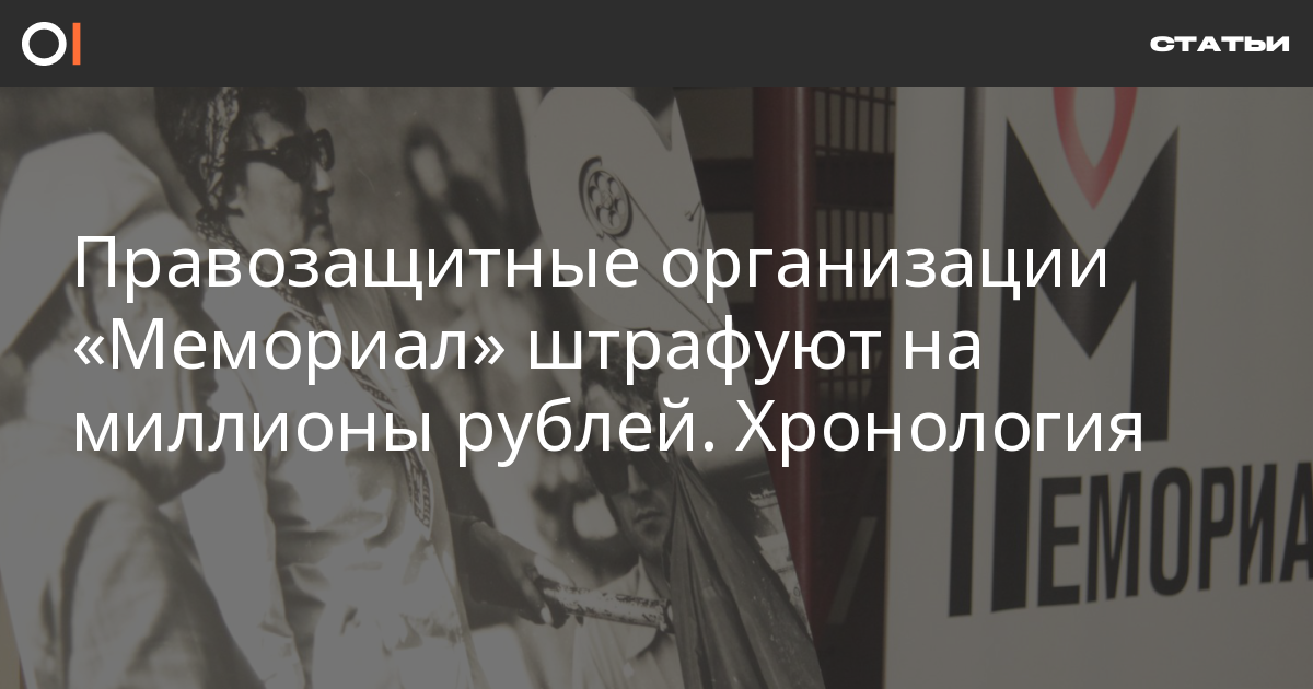 С октября 2019 года Правозащитный центр и Международное общество «Мемориал» оштрафовали за отсутствие маркировки «иностранного агента» в соцсетях и на сайтах на 5,2 миллионов рублей. Всего по этим обвинением составлено 28 протоколов. «Мемориал» организовал сбор средств на оплату штрафов. ОВД-Инфо публикует хронологию событий. Материал обновляется по мере вынесения новых решений суда.