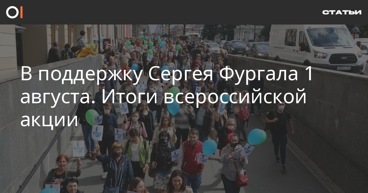 В России прошла очередная акция в поддержку арестованного бывшего губернатора Хабаровского края Сергея Фургала. Протесты продолжаются несколько недель. 1 августа демонстрации прошли в десятках городов, в том числе в Хабаровске, Москве, Петербурге, многих городах Сибири и Дальнего Востока. Несколько десятков человек задержали.