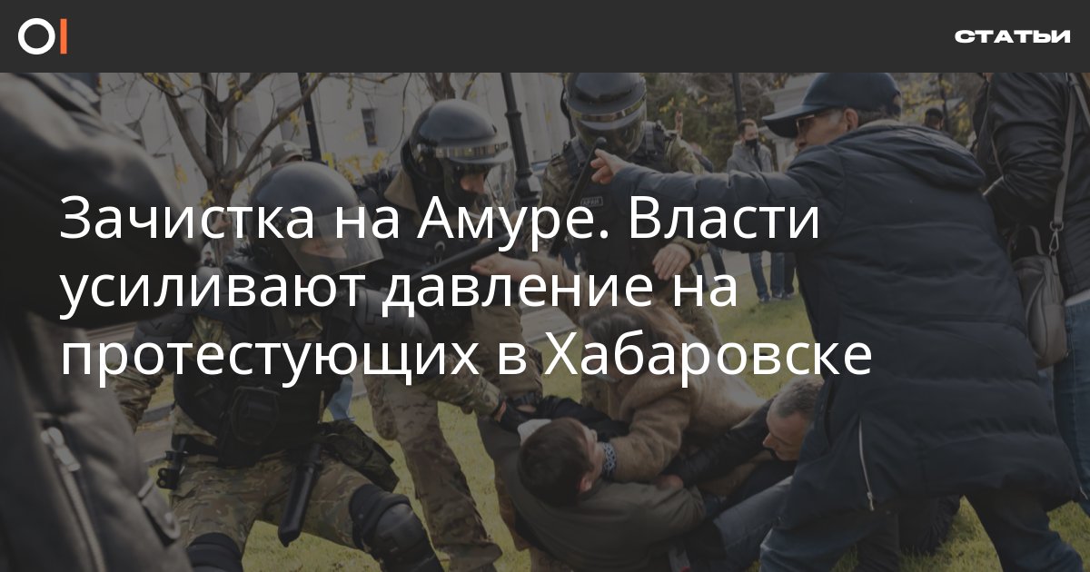 На протестующих в Хабаровске завели как минимум четыре уголовные дела: три — по статье о применении насилия в отношении полицейских (статья 318 УК), одно — по статье о неоднократных нарушениях на уличных акциях (статья 212.1 УК). Более десятка хабаровчан уже имеют три или более административки за уличные акции — соответственно, они также находятся под угрозой возбуждения дела по статье 212.1 УК.