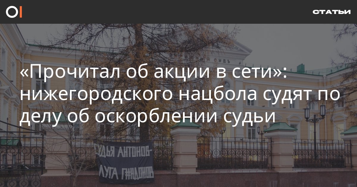 В Поволжье слушается уголовное дело об оскорблении судьи. Поводом стал вывешенный на ограждении здания Нижегородского районного суда Нижнего Новгорода баннер с надписью «Судья Антонов — слуга г#ндонов». Подозреваемым проходит местный нацбол Рамазан Сулейманов. Свою причастность он отрицает: уверен, что задержали его как видного члена нижегородского отделения незарегистрированной партии «Другая Россия».