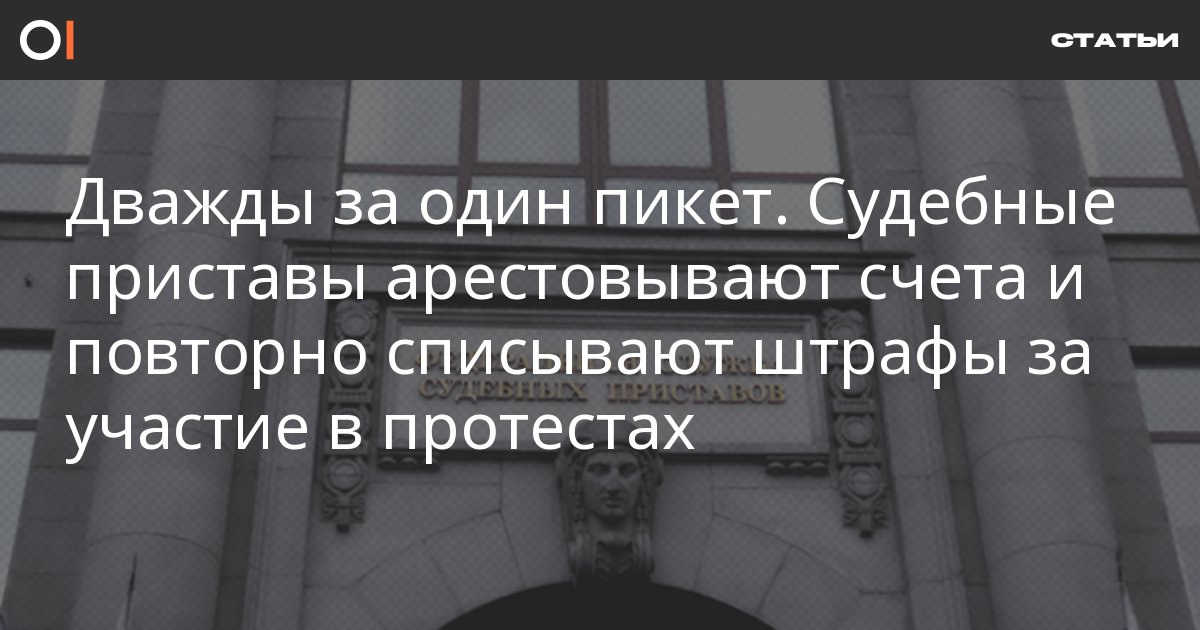 Участники акций протеста сталкиваются с повторными штрафами за один и тот же пикет или митинг. Даже после оплаты штрафов им блокируют счета и снова списывают деньги. Как минимум в случаях политика Марины Литвинович и журналиста «Эха Москвы» Александра Плющева Федеральная служба судебных приставов признала ошибку. ОВД-Инфо рассказывает о происходящем и советует, как можно себя обезопасить от такой ситуации.