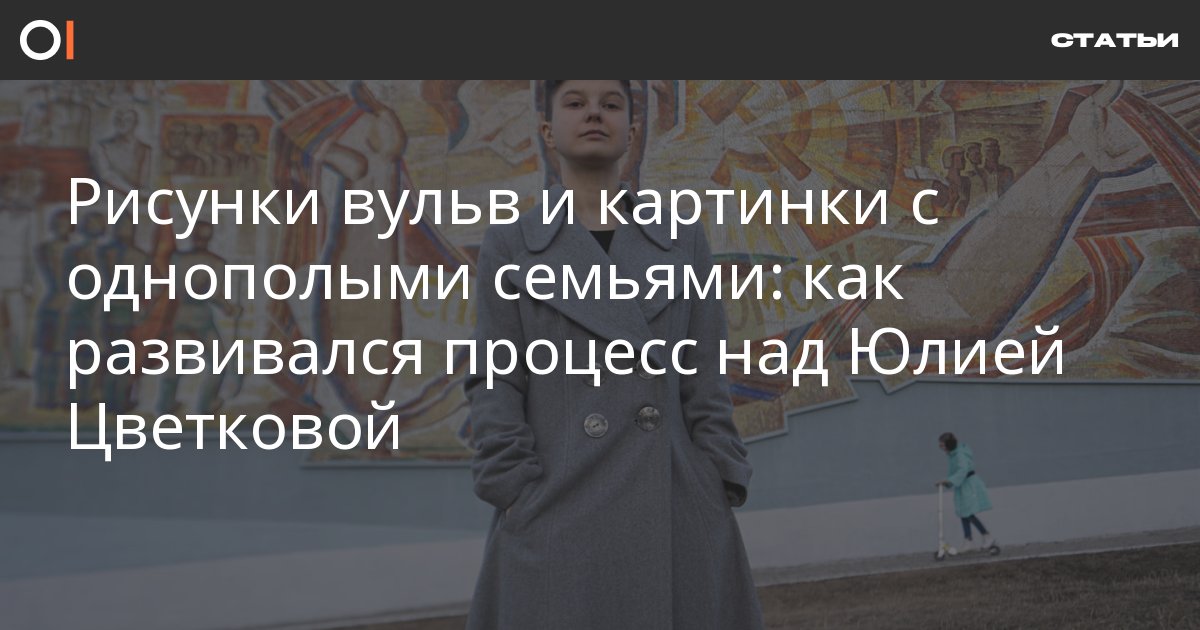 Процесс над художницей и активисткой из Комсомольска-на-Амуре Юлией Цветковой длится уже третий год. В отношении нее возбуждено уголовное дело о распространении порнографии (п. «б» ч. 3 ст. 242 УК) из-за рисунков вульв в паблике «Монологи вагины», а также четыре административных дела о пропаганде нетрадиционных сексуальных отношений среди несовершеннолетних из-за картинок с однополыми семьями. Рассказываем, как преследуют художницу.