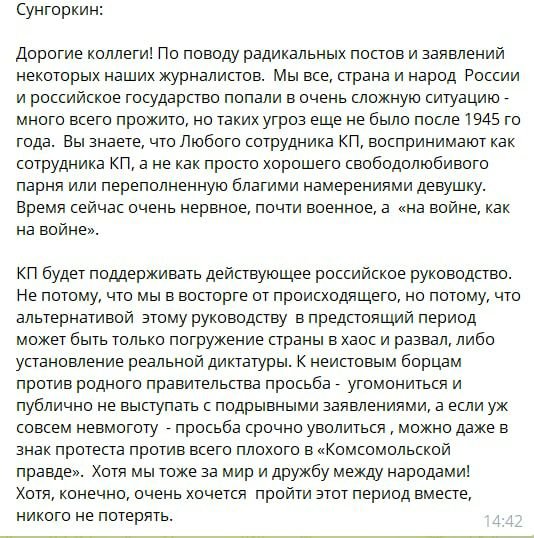 «25 февраля нам в чатик переслали сообщение генерального директора „Комсомольской правды“ [Владимира Сунгоркина]. Там человек вроде бы пытался сгладить углы, но я его восприняла однозначно, большинство коллег тоже. Это был неформальный запрет на посты в соцсетях и публичные заявления о военных действиях в Украине. По сути нам поставили ультиматум: или молчите, или уходите из компании», — рассказывает журналистка.