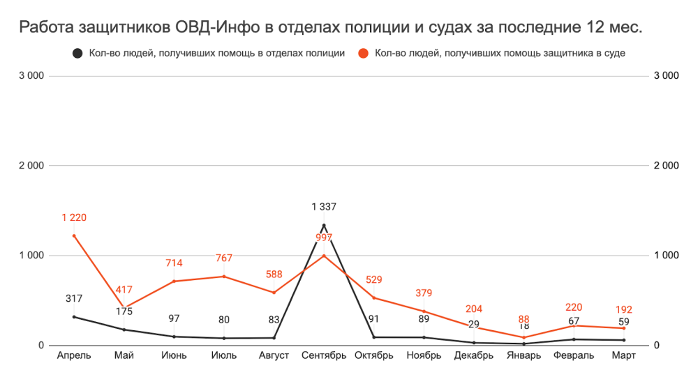- всего в марте адвокаты от ОВД-Инфо защищали 80 фигурантов по 64 уголовным делам в 34 городах.