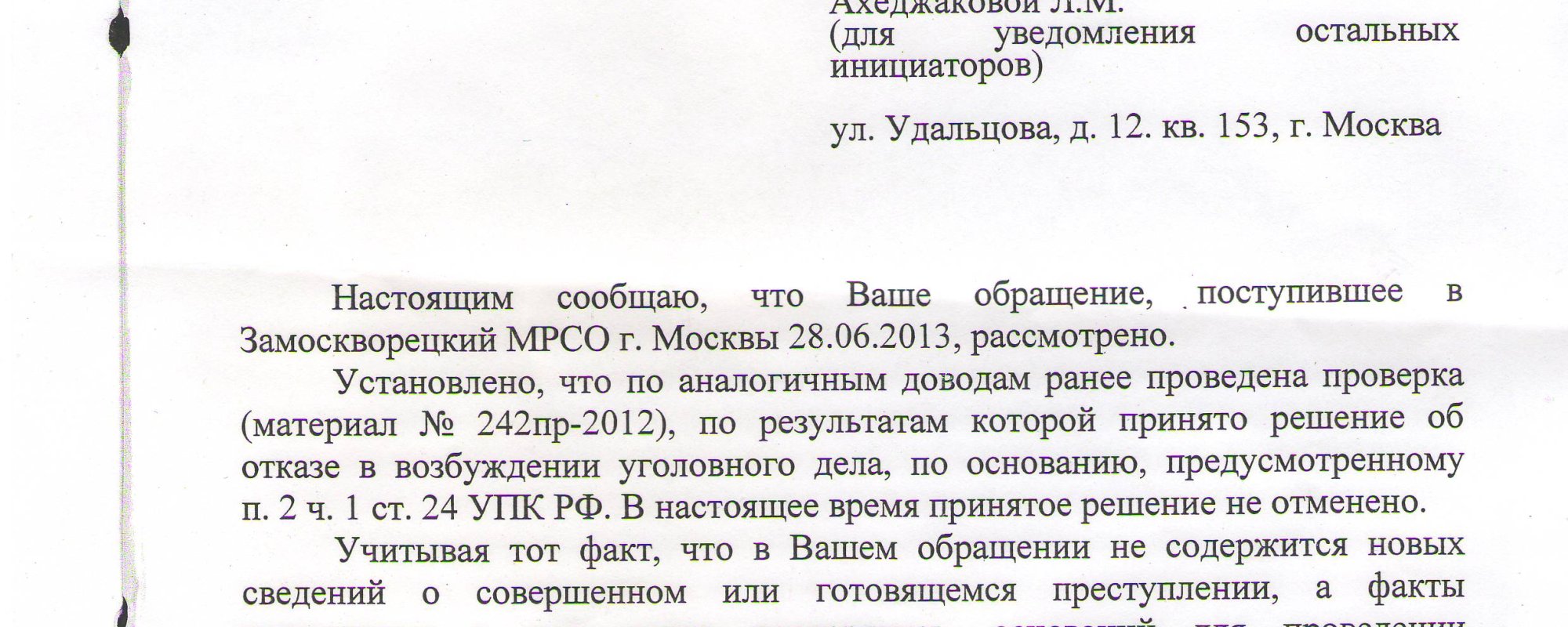 Установлено, что по аналогичным доводам ранее проведена проверка (материал № 242пр-2012), по результатам которой принято решение об отказе в возбуждении уголовного дела, по основанию, предусмотренному п. 2 ч. 1 ст. 24 УПК РФ. В настоящее время принятое решение не отменено.