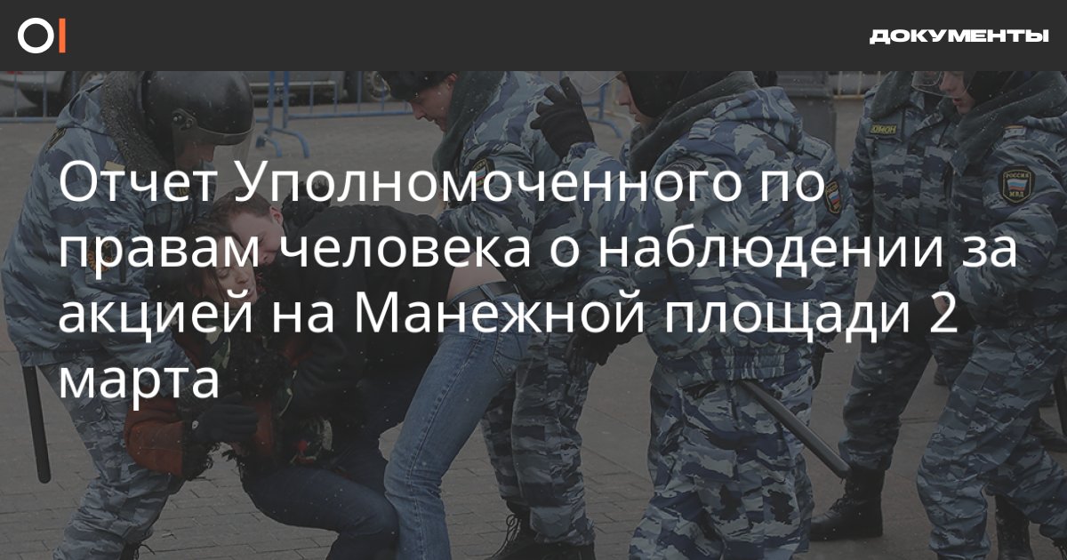 02.03.2014 г. в 14 ч. представитель Уполномоченного прибыл на Манежную площадь, которая была к этому времени огорожена по периметру металлическими барьерами и охранялась сотрудниками ОМОНа, лишь некоторые из которых имели идентификационные жетоны. Также ограждения были выставлены по ул. Тверской со стороны гостиницы Националь и у дома № 2 по ул. Тверской. Между тем в ограждении имелись разрывы, через которые можно было относительно свободно пройти. Проход к площади со станции метро «Охотный ряд» был закрыт полицией.