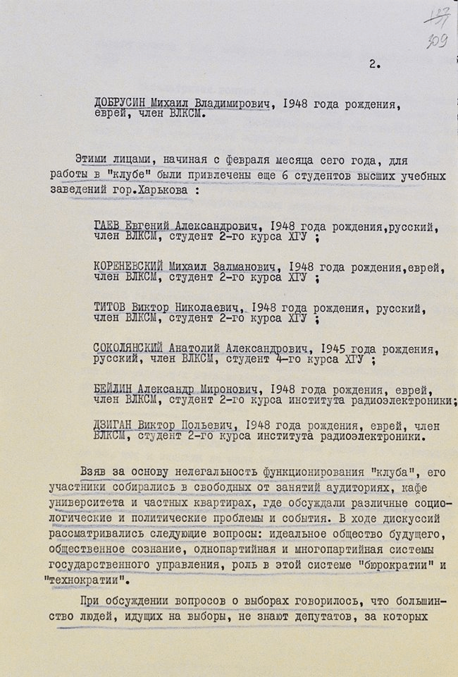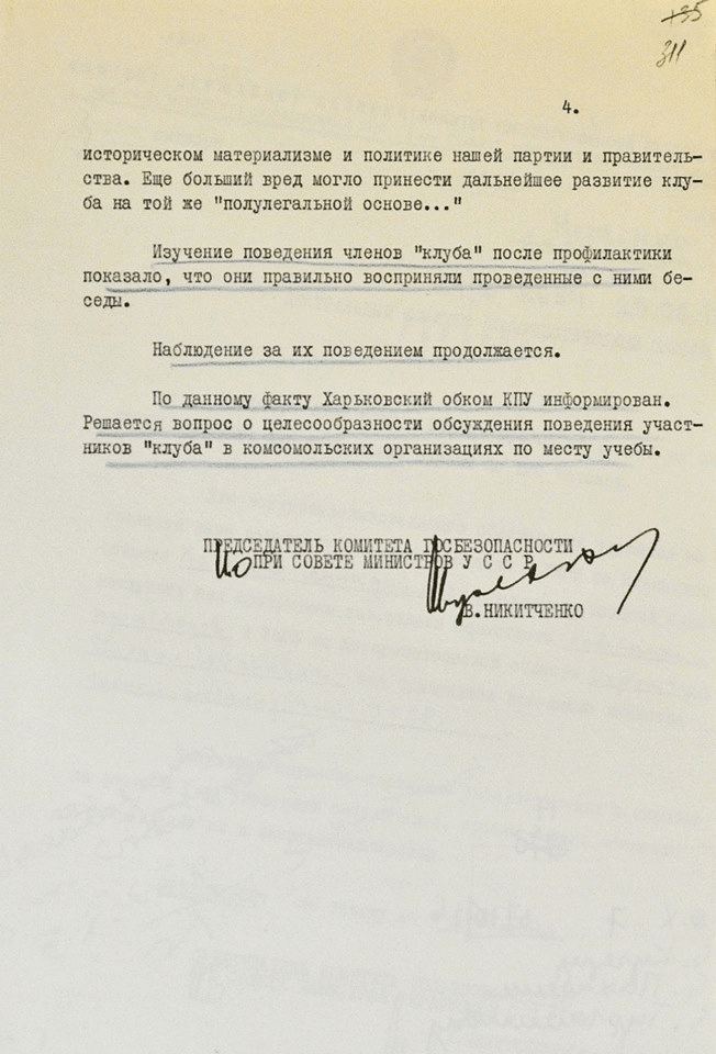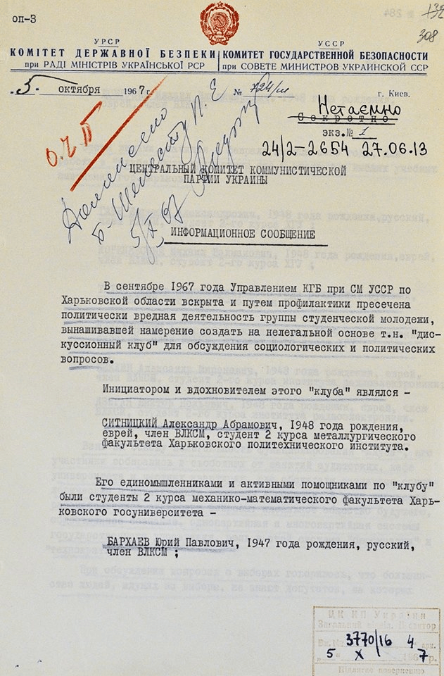 Глава спецслужбы советской Украины отчитывался руководителю республики о том, что в Харькове была «вскрыта и путем профилактики пресечена политически вредная деятельность группы студенческой молодежи, вынашивавшей намерение создать т.н. „дискуссионный клуб“ для обсуждения социологических и политических вопросов».
