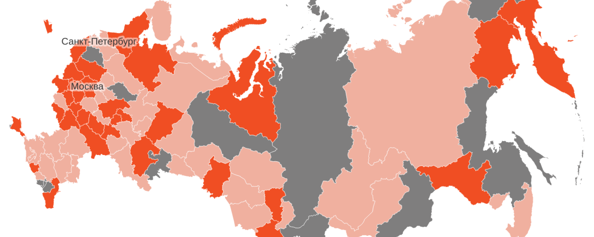 In 35 regions, restrictions apply directly to public events. In 26 of them (including Moscow and St. Petersburg), all public events are banned, regardless of the number of participants. Even one-person protests are prohibited. In some cases, the ban is not complete, but the participants' numbers, possible rally formats, and venues are restricted, or the approval procedure becomes more complicated. In some regions, bans are formulated in the form of recommendations, which may lead to refusals in approvals.