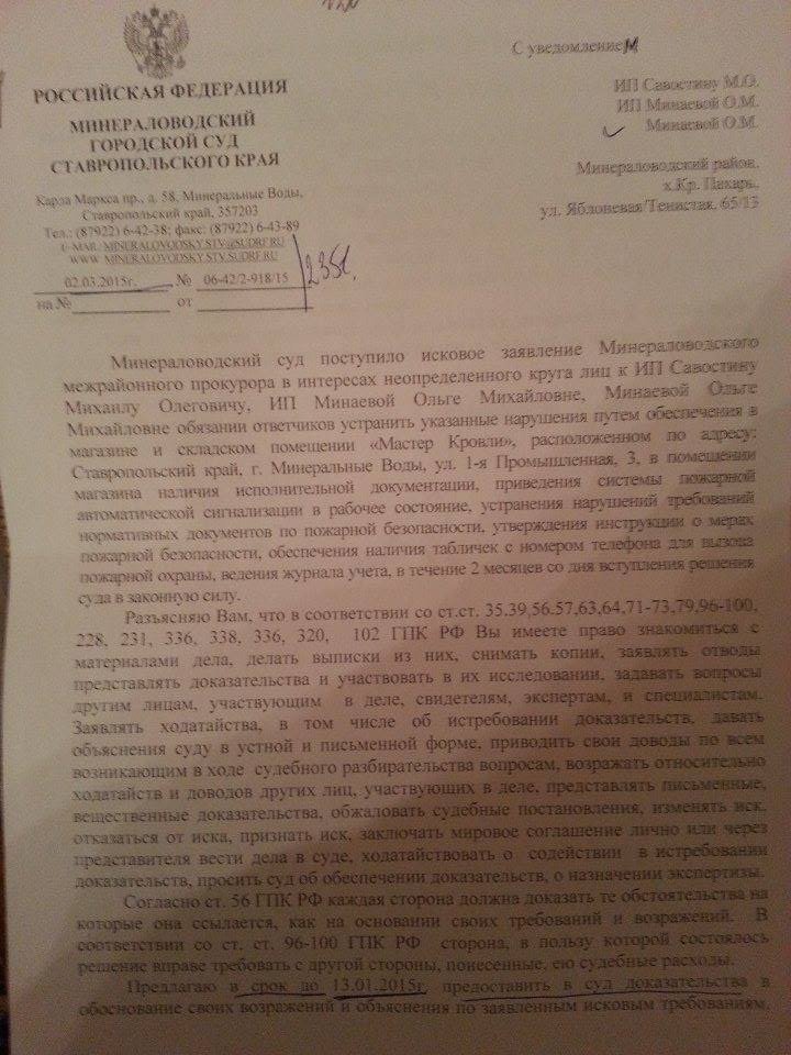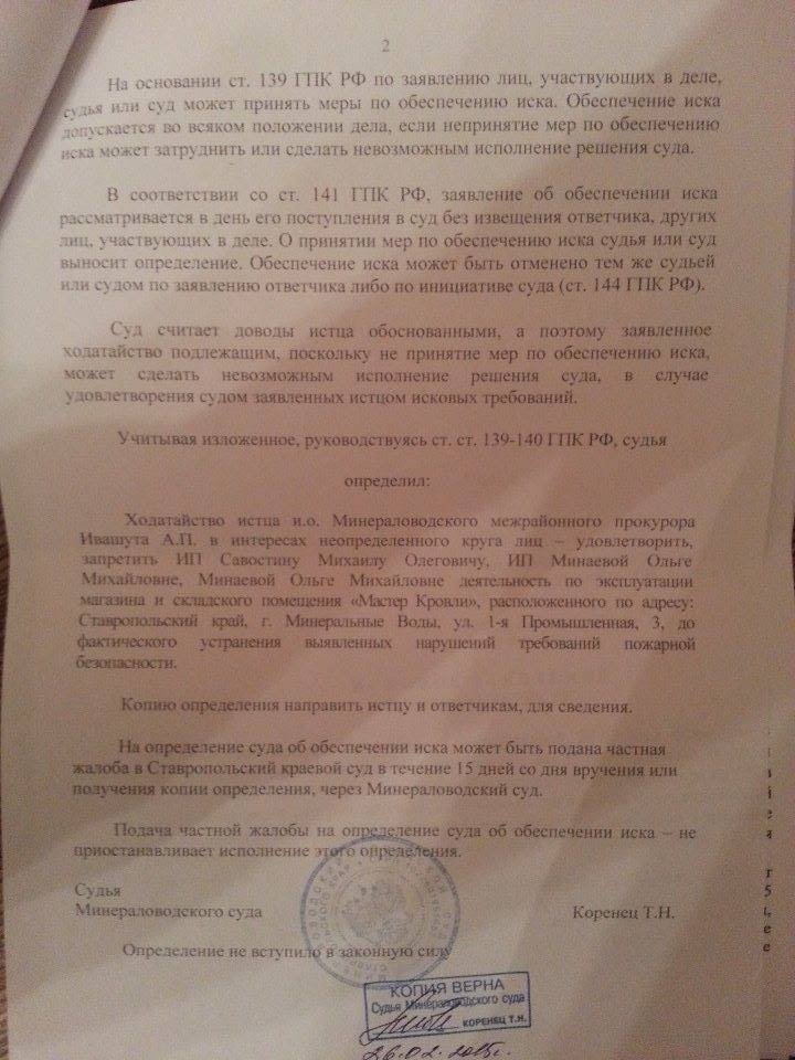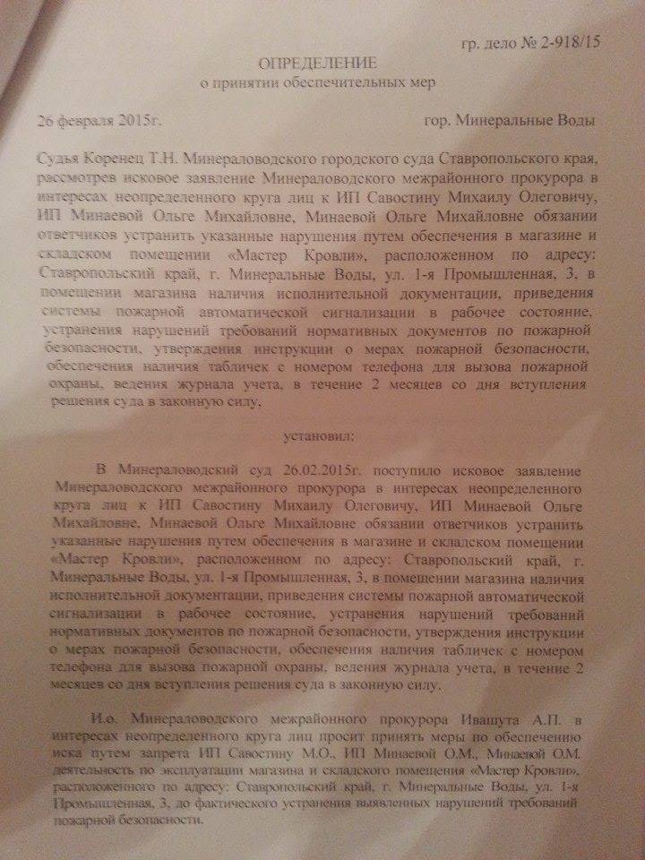 Минераловодский городской суд запретил местному активисту Михаилу Савостину заниматься торговлей. Поводом послужила проверка его офиса МЧС и прокуратурой. Проверка проводилась по жалобе человека по фамилии Жмуров, который якобы является клиентом Савостина, при этом активист утверждает, что такого клиента у него никогда не было. У Савостина нашли нарушения пожарной безопасности. Судебное разбирательство по иску прокурора должно пройти 17 марта, однако суд еще до проведения разбирательства постановил в качестве обеспечительной меры запретить предприятию Савостина вести деятельность в магазине и на складе «до фактического устранения выявленных нарушений требований пожарной безопасности». Савостин сообщил ОВД-Инфо, что 9 марта ему придется уволить всех сотрудников, поскольку «работать не дадут». Активист полагает, что решение суда связано его политической позицией и поездкой на территорию Украины.