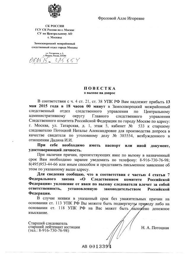 Активисток Аллу Фролову и Ирину Калмыкову вызвали повестками на допрос в Следственный комитет по делу Ильдара Дадина, обвиняемого в неоднократном нарушении порядка проведения публичных мероприятий. Допрос Фроловой назначен на 13 мая, допрос Калмыковой — на 18 мая.