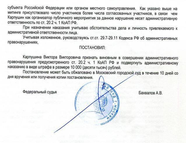 Организатор митинга против платных парковок, прошедшего 6 октября на северо-востоке Москвы, оштрафован по решению Останкинского районного суда на десять тысяч рублей. Суд посчитал, что Виктор Карпушин совершил правонарушение, предусмотренное 1-й частью ст. 20.2 КоАП (нарушение организатором публичного мероприятия установленного порядка организации либо проведения собрания, митинга, демонстрации, шествия или пикетирования).