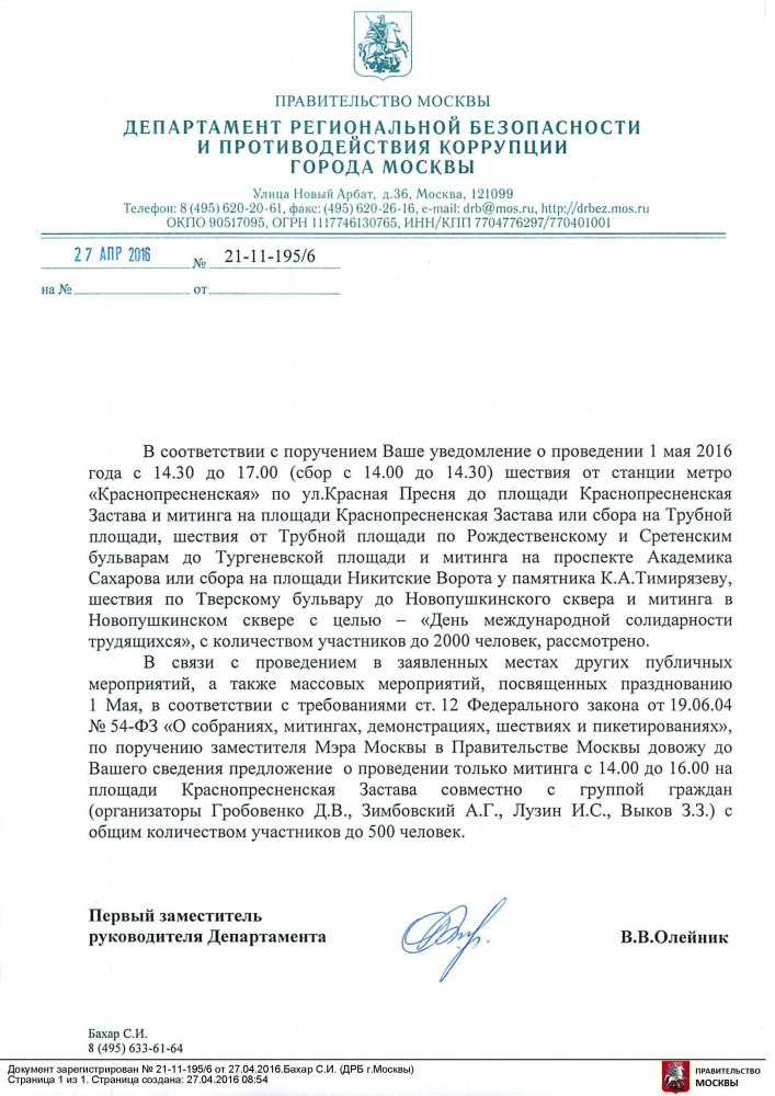 В уведомлении, поданном организаторами, были указаны три варианта маршрута шествия, которое должно было завершиться митингом. Мэрия согласовала лишь митинг на площади Краснопресненская Застава, причем если заявители предполагали участие двух тысяч человек, то мэрия сократила количество участников до пятисот. Причина такого решения, согласно документу, — проведение в заявленных левыми местах других мероприятий. Пресс-служба московского комитета партии РОТ ФРОНТ отмечает, что мэрия нарушила федеральное законодательство в части сроков предоставления ответа на уведомления о публичных мероприятиях.