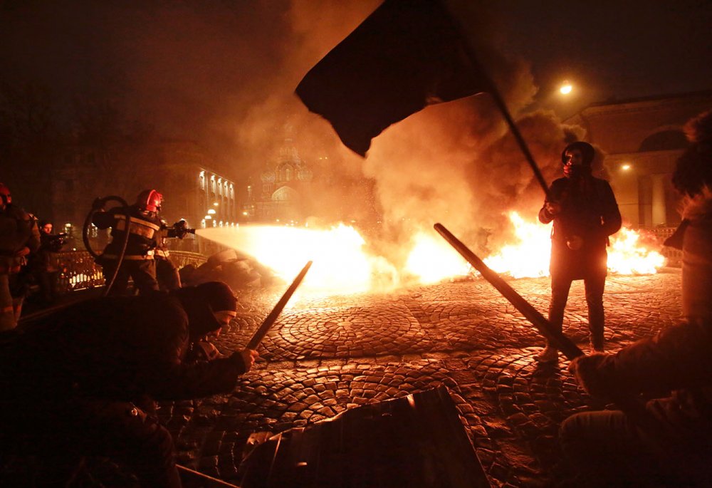 23 февраля 2014 года Павленский и еще пятеро активистов провели акцию на Мало-Конюшенном мосту в Петербурге, желая выразить поддержку киевскому Майдану. Они привезли на мост автомобильные покрышки, бензин, палки, металлические листы, черный анархисткий флаг и флаг Украины, сложили из покрышек баррикаду и подожгли ее, а также били по листам деревянными палками. Манифест акции гласит: «Горящие покрышки, флаги Украины, чёрные флаги и грохот ударов по железу — это песня освобождения и революции. Майдан необратимо распространяется и проникает в сердце Империи. Борьба с имперским шовинизм продолжается; храм Спаса на Крови — это место где народовольцы совершили успешное покушение на императора, жестоко расправлявшегося с освободительными восстаниями в Правобережной Украине, Польше, Литве и Белоруссии. Мы боремся за нашу и вашу свободу. В этот день, когда государство призывает праздновать день защитника отечества — мы призываем всех встать на праздник Майдана и защиту своей свободы. Мосты горят и назад дороги уже нет».