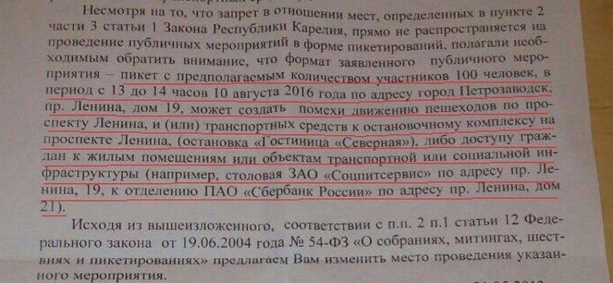 «В письме было отмечено, что работы продлятся до 1 августа. Организаторы пикета вновь подали заявку на 10 августа. На этот раз на первый план вышла забота о населении: по мнению сотрудников Госкомитета по обеспечению жизнедеятельности и безопасности населения Карелии, проведение акции с 13.00 до 14.00 могло «создать помехи движению пешеходов по проспекту Ленина, и (или) транспортных средств к остановочному комплексу на проспекте Ленина, либо доступу граждан к жилым помещениям или объектам транспортной или социальной инфраструктуры (например, столовая ЗАО „Соцпитсервис“…)», пишет издание.