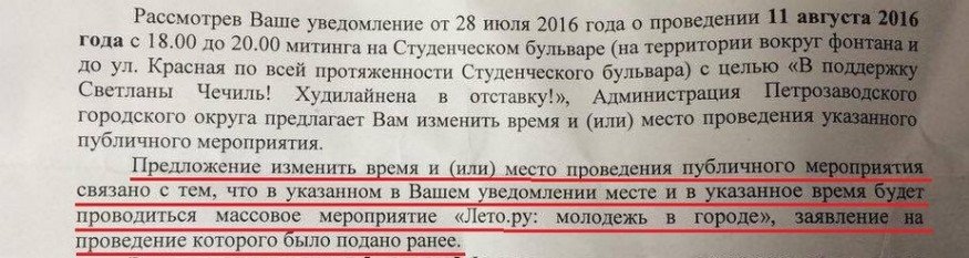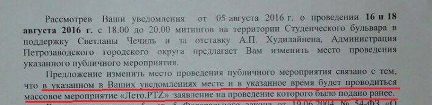 11 августа администрация карельской столицы отказала в проведении митинга на Студенческом бульваре из-за массового мероприятия «Лето.ру: молодежь в городе». Мероприятие так и не состоялось.