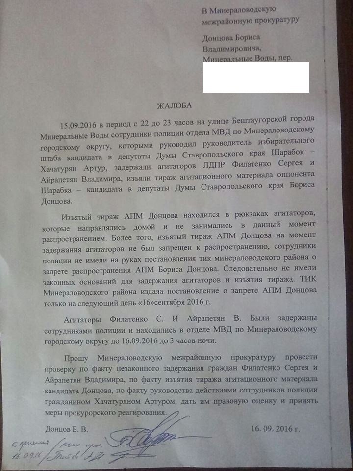 Как стало известно, 15 сентября около 23 часов, в Минеральных Водах (Ставропольский край) на улице были задержаны двое агитаторов от ЛДПР — Сергей Филатенко и Владимир Айрапетян. Они были доставлены в ОВД по Минералводскому городскому округу и пробыли там до трех часов ночи. После задержания из рюкзака агитаторов были извлечены и изъяты агитационные материалы.