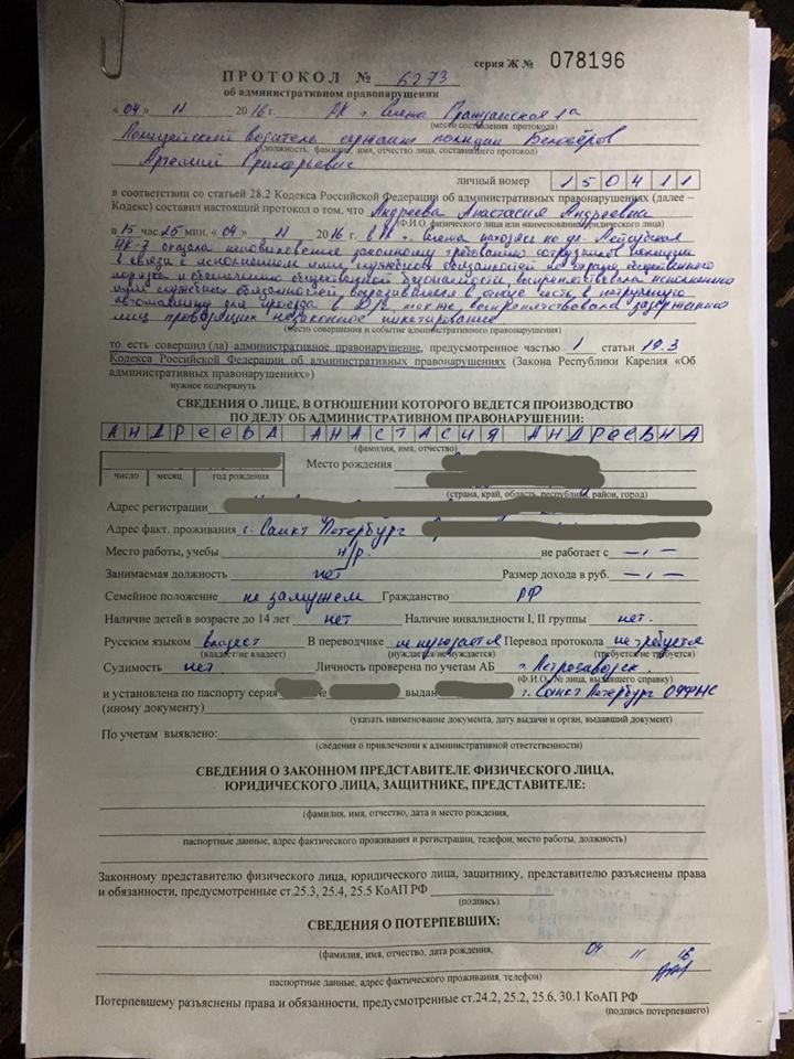 Судья Сегежского городского суда Наталья Ткачук 5 ноября признала виновной Анастасию Андрееву, которая днем ранее была задержана за то, что снимала на камеру пикет возле колонии Ильдара Дадина, в неповиновении распоряжению полицейского. Судья после двух часов, проведенных в совещательной комнате, приняла решение назначить Андреевой административный штраф в 700 рублей. Об этом на своей странице в Facebook написал Динар Идрисов.