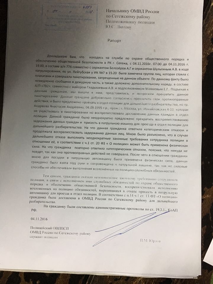 Остальных семерых задержанных 4 ноября на пикете возле колонии, где отбывает наказание Ильдар Дадин, отпустили в тот же вечер, составив протоколы об административных правонарушениях по части 5 статьи 20.2 (нарушение участником публичного мероприятия порядка его проведения). Анастасия Андреева провела ночь в камере для административно задержанных отделения полиции Сегежа.