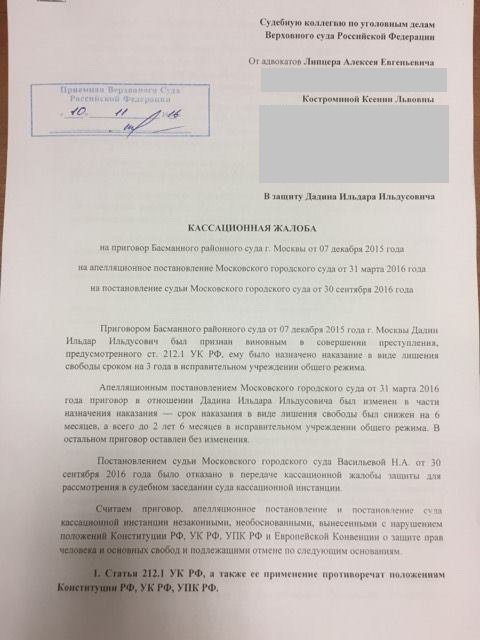 Адвокаты Ильдара Дадина, осужденного по обвинению в «неоднократных нарушениях правил проведения публичных мероприятий», подали кассационную жалобу в судебную коллегию Верховного суда на приговор. Об этом сообщила в Twitter жена Дадина Анастасия Зотова.