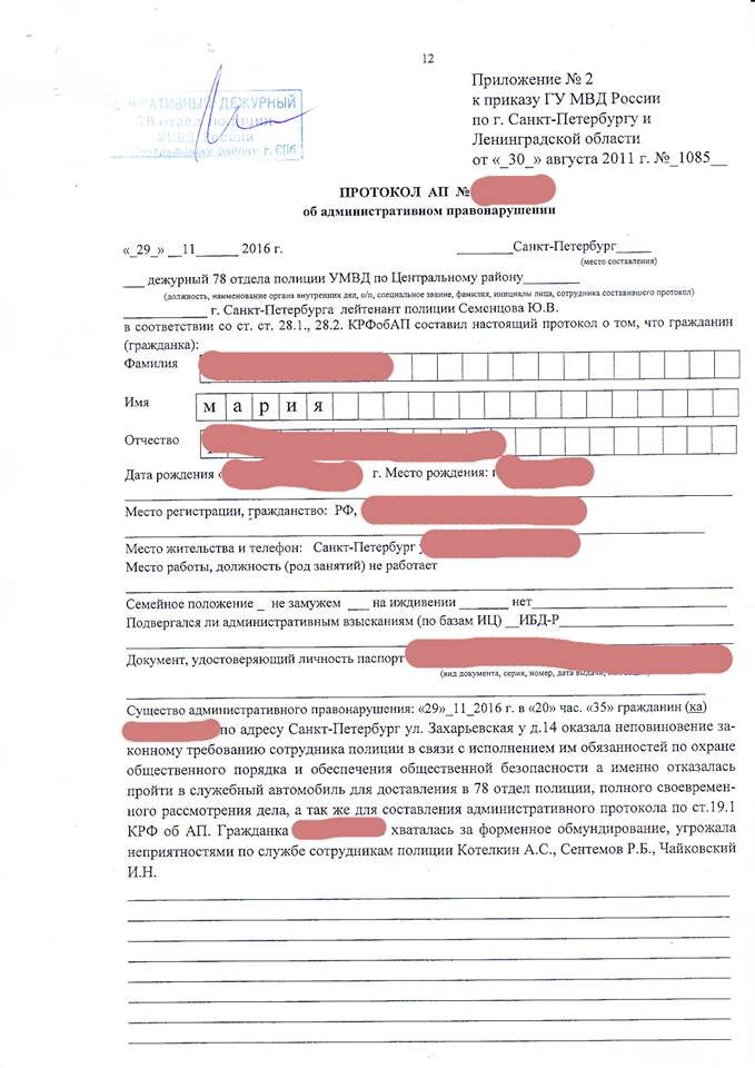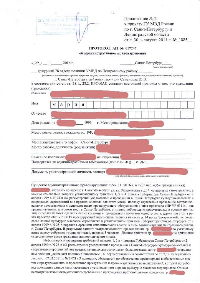 Мария Лакертиан была обвинена в самоуправстве (ст.19.1КоАП) и в неповиновении законному распоряжению сотрудника полиции (ст. 19.3 КоАП). Второй задержанный, Иван Мурза, был обвинен только в самоуправстве. По словам Идрисова, протокол по 19.3 КоАП на Лакертиан был составлен спустя два часа после задержания по указанию сверху. Однако в камеру для административно задержанных ее не поместили и в суд на следующий день везти не планировали, поэтому защитнику удалось добиться ее освобождения из отдела.