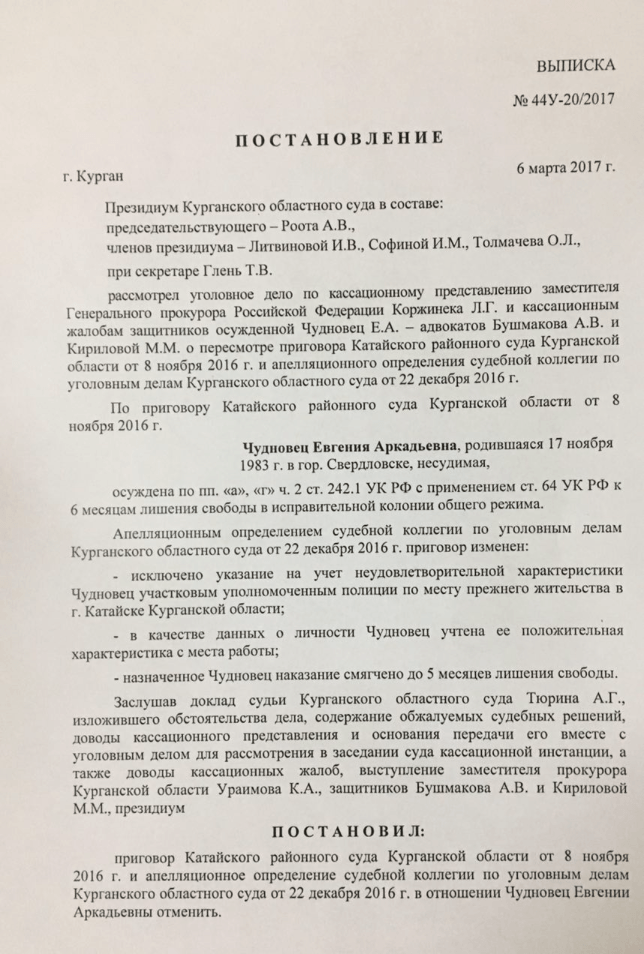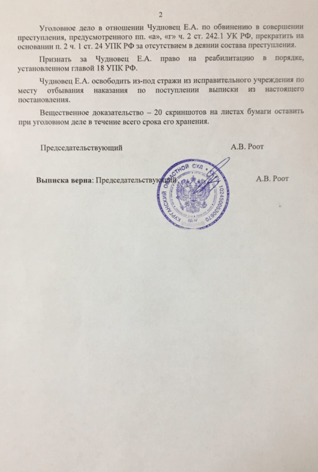6 марта Президиум Курганского областного суда отменил приговор в отношении воспитательницы Евгении Чудновец, приговоренной к пяти месяцам колонии за распространение ролика с издевательством над ребенком. Суд также постановил немедленно освободить Чудновец из колонии. Об этом сообщает РАПСИ со ссылкой на адвоката Алексея Бушмакова. Сама Чудновец не участвовала в заседании, т. к. возникли технические сложности с видеосвязью.