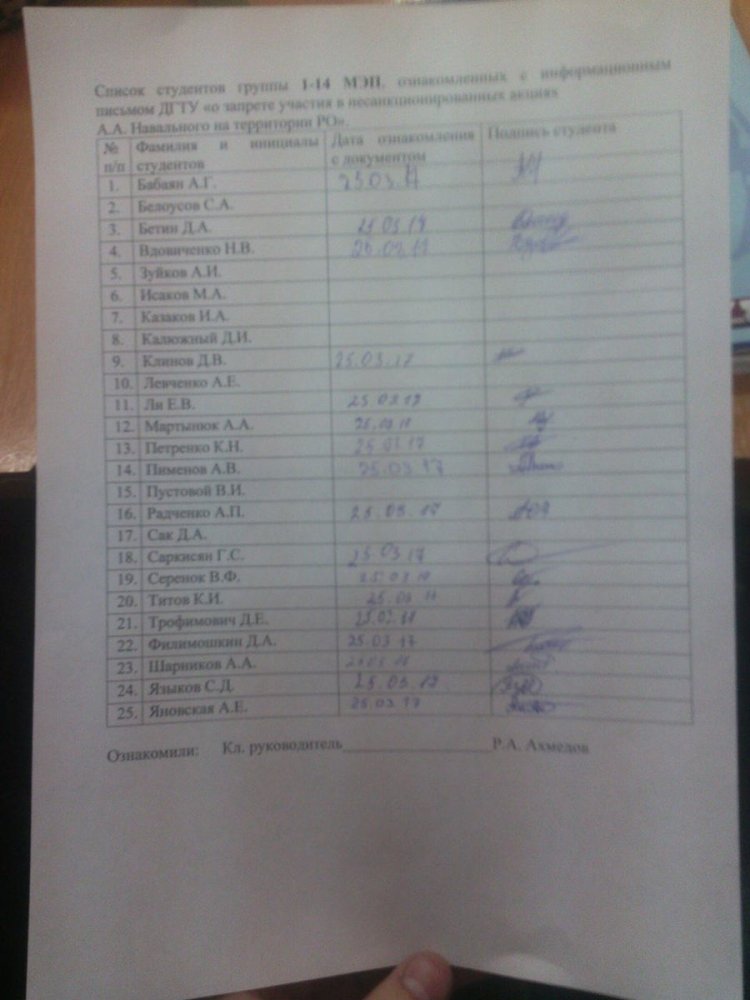 В колледжах в Ростове-на-Дону учащихся под угрозой отчисления заставляют подписывать бумагу о том, что они не пойдут 26 марта на митинг против коррпуции. Об этом с Twitter сообщил руководитель предвыборного штаба Алексея Навального Леонид Волков.