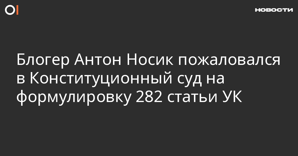 Блогер Антон Носик, приговоренный к штрафу по ст. 282 УК (экстремизм) за пост о жителях Сирии, обжаловал формулировку 282 статьи в Конституционном суде Российской Федерации. Об этом сообщают «РИА Новости» со ссылкой на адвоката «Открытой России» Сергея Бадамшина, представляющего интересы Носика в суде.