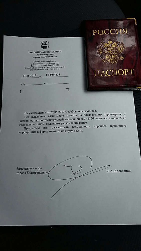 «Все заявленные вами места и места на близлежайших территориях (…) 12 июня 2017 года заняты лицом, подавшим уведомление заранее», — сказано в опубликованном в группе «Требуем Ответов» в Благовещенске» отказе.