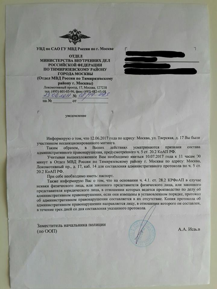 Одному из задержанных на акции 12 июня в центре Москвы пришло уведомление из ОВД «Тимирязевский», в котором его просят явиться в отдел для составления протокола. Об этом пишет в фейсбуке активистка Ирина Яценко.