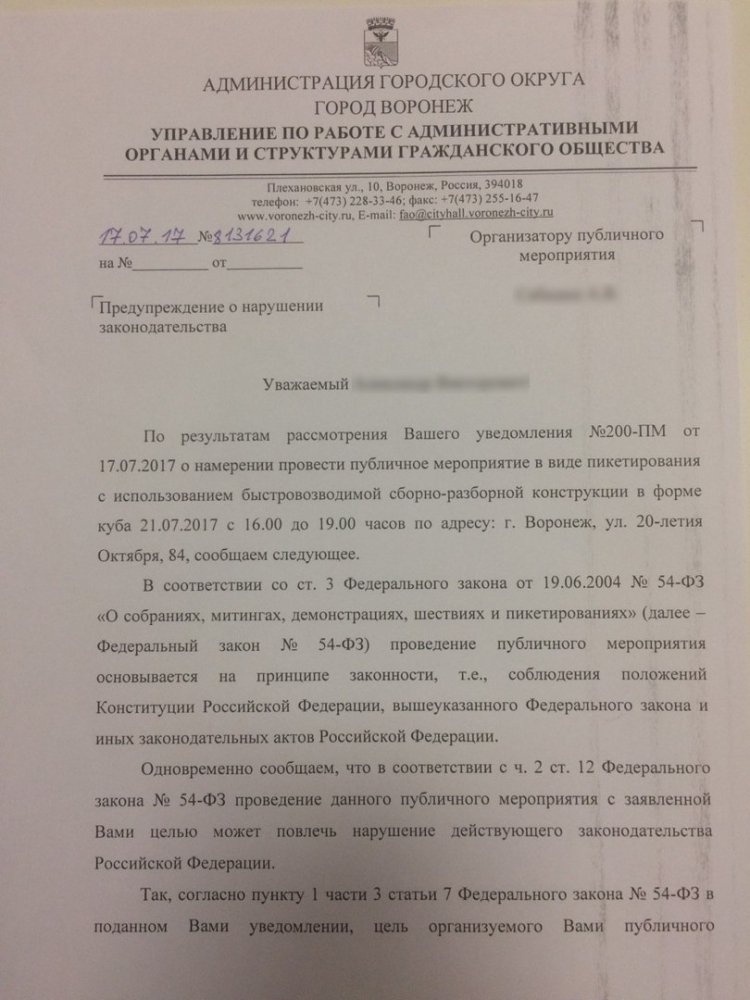 «Заявленная Вами цель проведения публичного мероприятия нарушает часть 3 статьи 17 Конституции РФ — „осуществление прав и свобод человека и гражданина не должно нарушать осуществления прав и свобод других лиц“. Вместе с тем, преждевременная агитация за одного кандидата в президенты РФ нарушает права и свободы других лиц, которые могут выдвинуть свои кандидатуры в установленные законом сроки, так как они в наименьшей степени смогут агитировать за себя», — сказано в отказе.