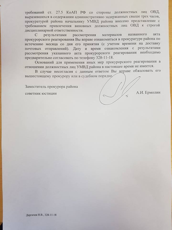 Прокуратура Василеостровского района Петербурга требует привлечь «к строгой дисциплинарной ответственности» сотрудников отдела полиции № 30 за условия, в которых находились задержанные после акции 26 марта. Об этом 1 августа в фейсбуке написала член местной Общественной наблюдательной комиссии Яна Теплицкая.