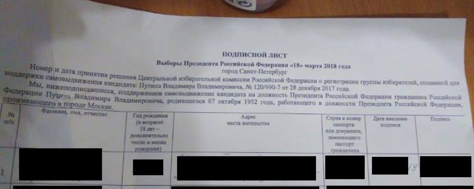 Студенты Санкт-петербургского политехнического университета рассказали, что их принуждают собирать подписи за выдвижение кандидата в президенты России Владимира Путина. Об этом на своей странице в фейсбуке написала член Молодежной коллегии при Губернаторе Санкт-Петербурга Оксана Борисова.