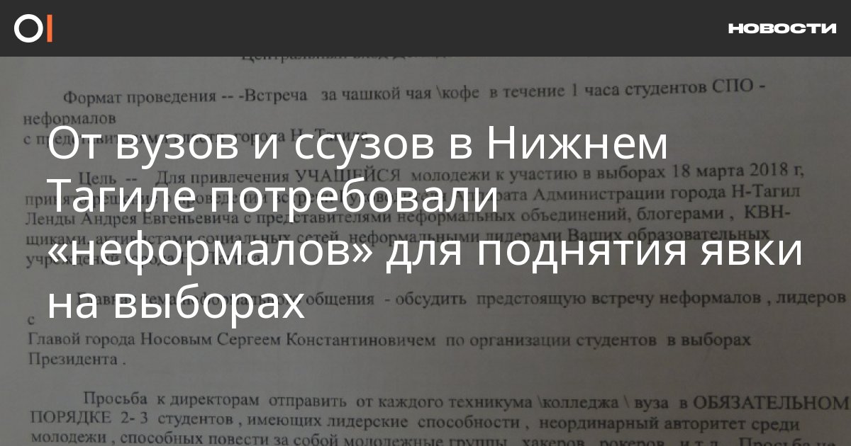 «Просьба к директорам отправить от каждого техникума\колледжа\вуза в ОБЯЗАТЕЛЬНОМ ПОРЯДКЕ 2–3 студентов, имеющих лидерские способности, неординарный авторитет среди молодежи, способных повести за собой молодежные группы, хакеров, рокеров и т. д. Просьба не посылать организованную мотивированную молодежь, председателей студенческих советов, положительных лидеров, старост, которые уже известны в своей среде. Ответственность за СВОЕВРЕМЕННОЕ прибытие до места проведения данного мероприятия своих кандидатов возлагается на образовательное учреждение. Сопровождать студентов во время мероприятия не надо. Постаралась осветить инициативу Администрации города — поднять молодежь на выборы любой ценой», — говорится в документе.