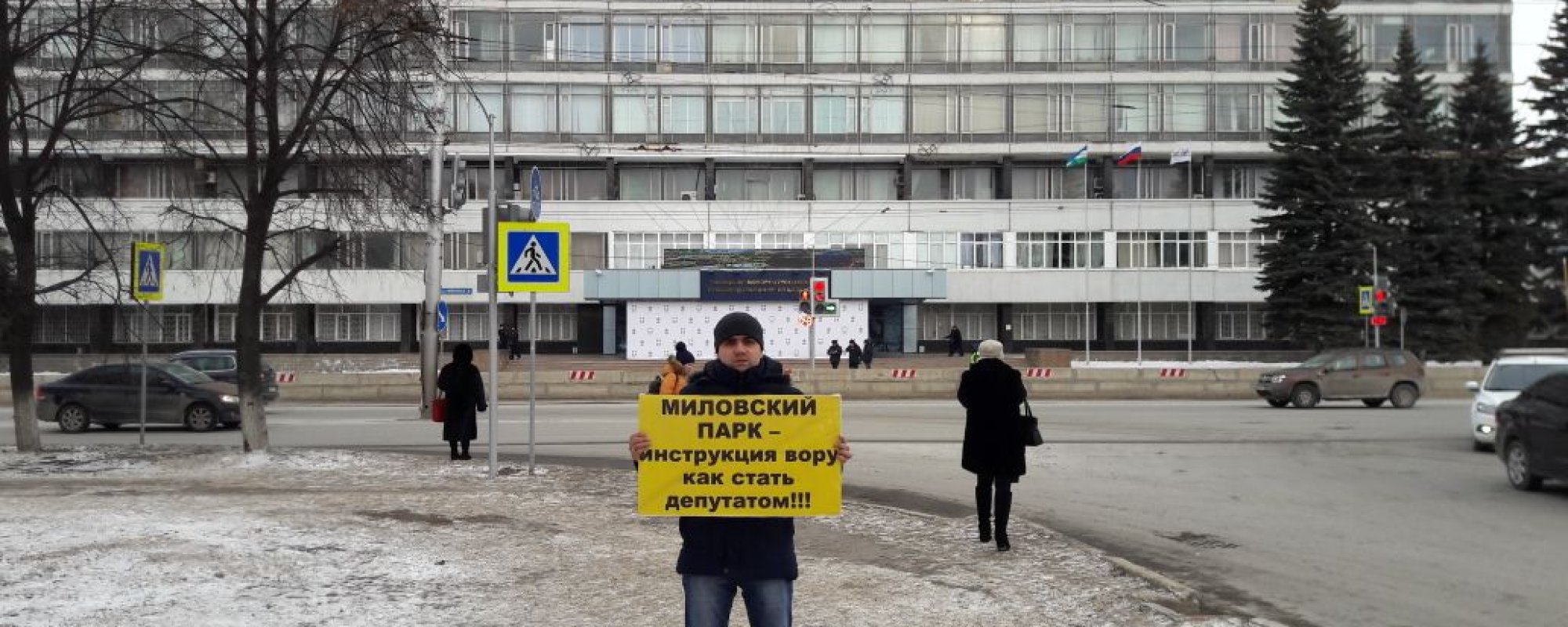 В Уфе в день приезда президента Владимира Путина задержали участника акции протеста обманутых дольщиков ЖК «Миловский парк». Он стоял с плакатом в одиночном пикете, сообщается в группе «11 квартал — ЖК Миловский парк».