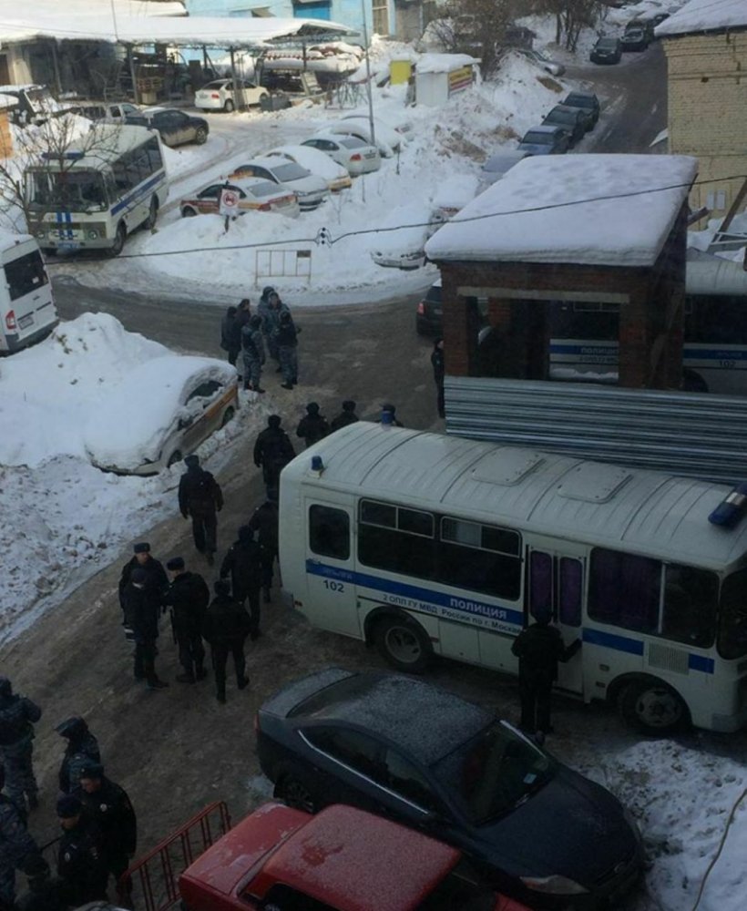 UPD 13:12 Полиция закончила проверять документы и покидает помещение. Человек, сначала задержанный по неизвестной причине, отпущен.
