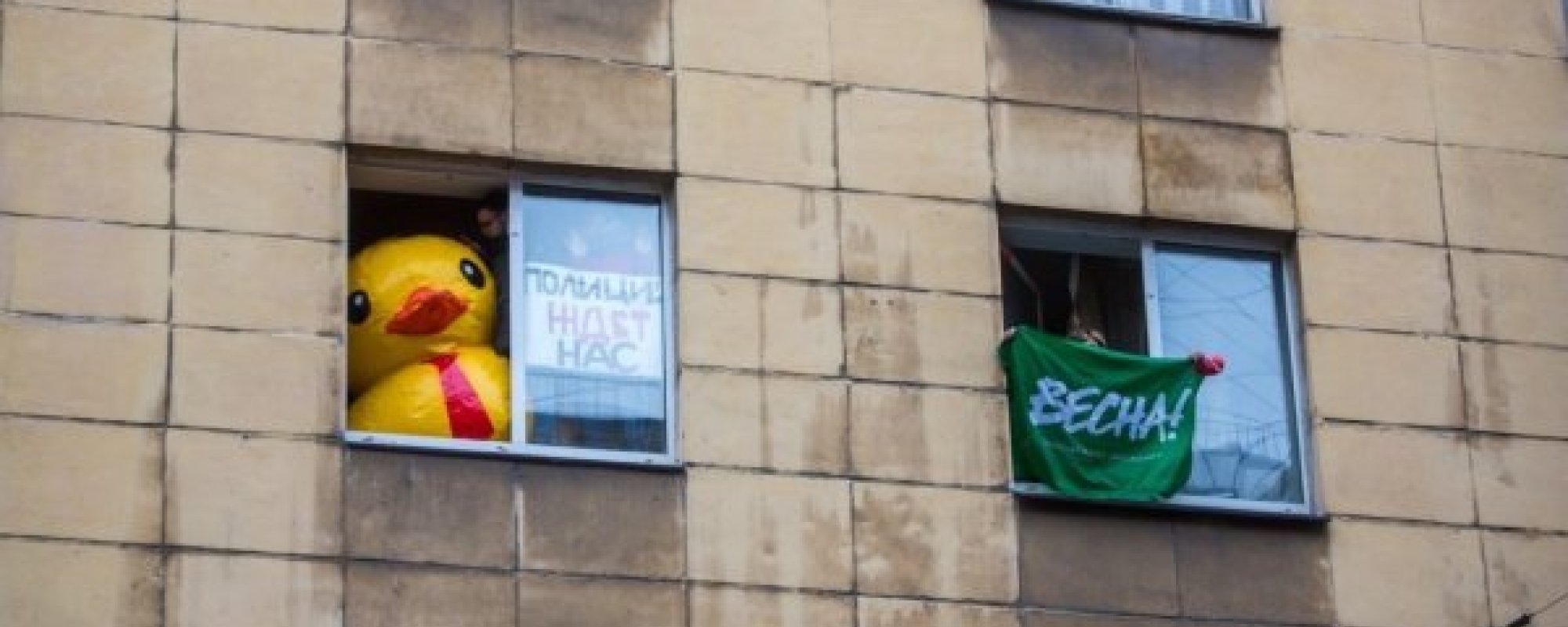 - В тот день активисты «Весны» провели перфоманс: они открыли окна и поставили на подоконник надувную желтую уточку. Окна квартиры активиста выходят на улицу, где проходило шествие. Полицейские, увидев это, пытались попасть домой к Гончаренко.