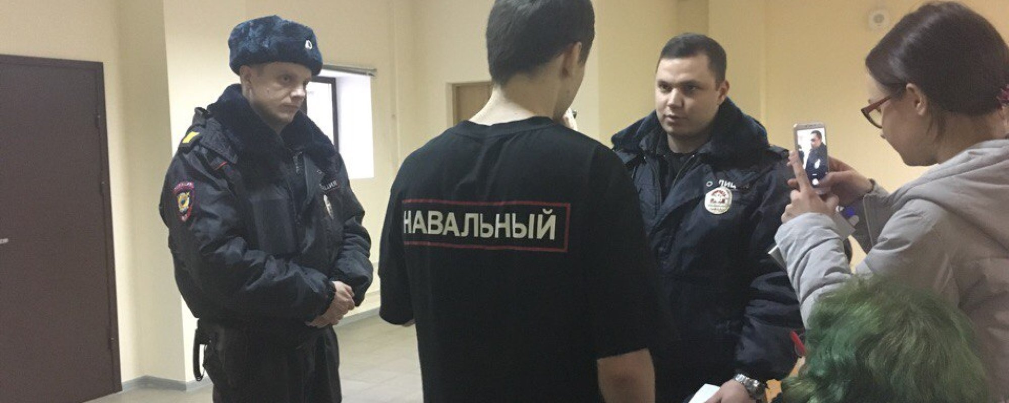 UPD (18:30): у Казаченко собираются изымать футболку с надписью «Навальный». По его словам, в отделе полиции все еще находятся арестованные 13 марта сторонники Навального, которых должны увезти в спецприемник.