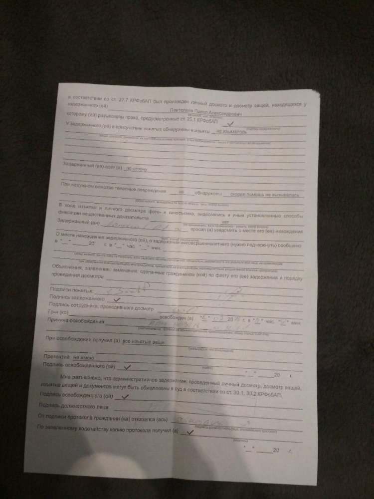 В половину второго ночи связь с ним прервалась. У активиста сел телефон. Александр Литреев приехал в отдел полиции. Там ему сказали, что к Пантелееву «приходили мама с папой, мама уже ушла». Когда Литреев попросил передать воду задержанному, ему ответили: «Мы на Почту России похожи? Выйдет — поест».