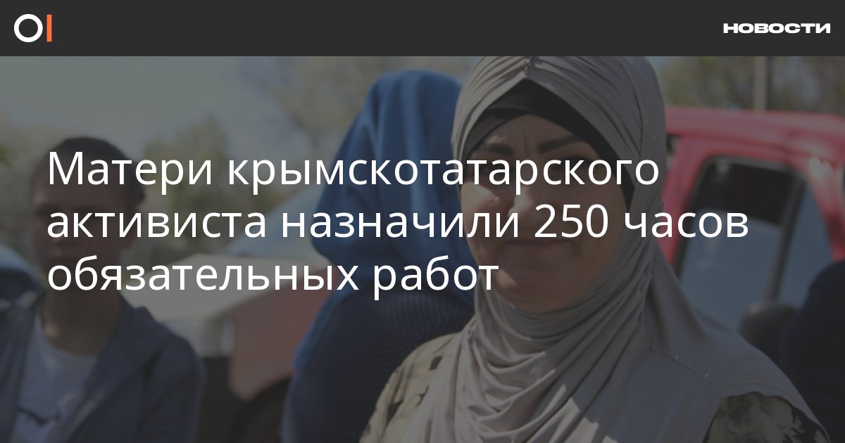 В Крыму Кировский суд назначил матери крымскотатарского активиста Гирая Куламетова Зареме Куламетовой 250 часов обязательных общественных работ и штраф в размере 20 тысяч рублей как компенсацию потерпевшему полицейскому. Об этом сообщают «Крым. Реалии».