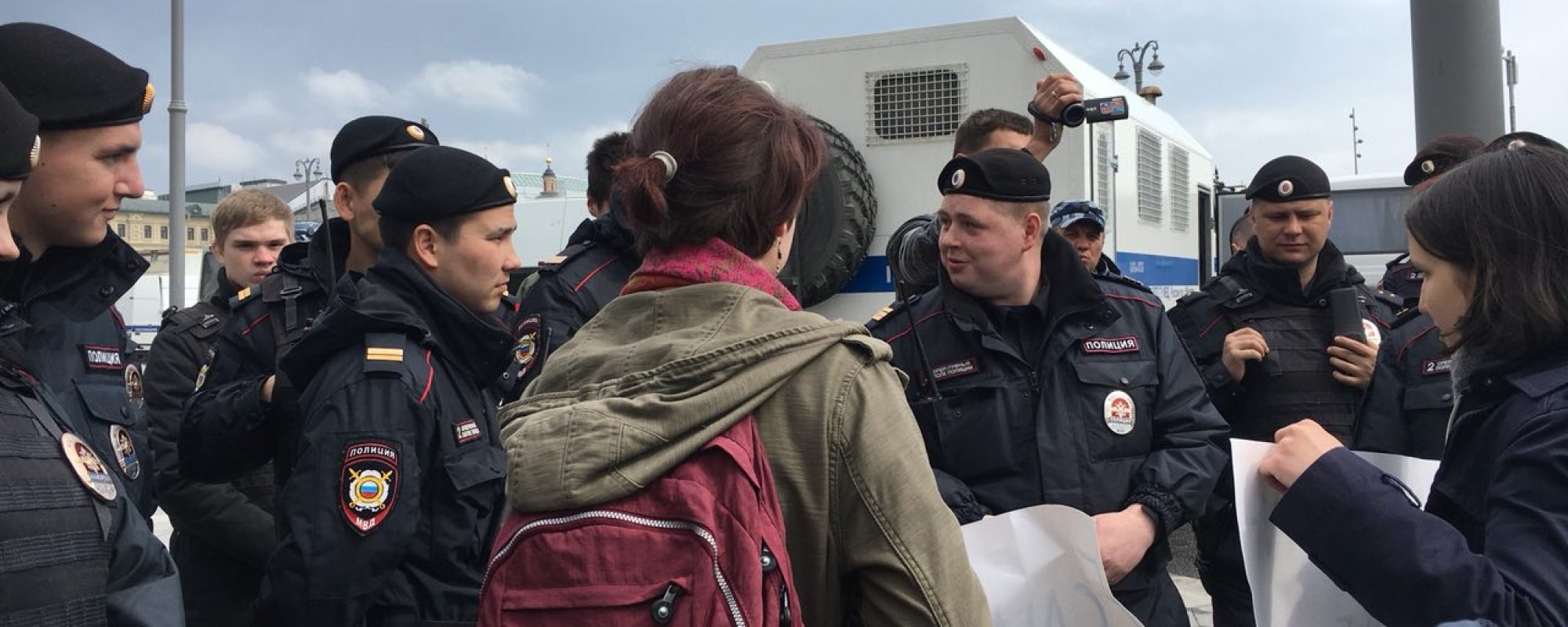 UPD 12:26 В отделе полицейские говорят, что акция не соответствует цели мероприятия. Медведева передает, что каждого задержанного вызывают по одному на опрос, где будут говорить о его плакате.