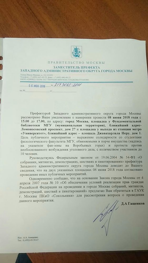 Власти Москвы отказались согласовывать пикет в поддержку студента МГУ Дмитрия Петелина, которого подозревают в вандализме (ст. 214 УК) из-за испорченного указателя к Чемпионату мира по футболу. Об этом говорится на сайте профсоюза «Университетская солидарность».