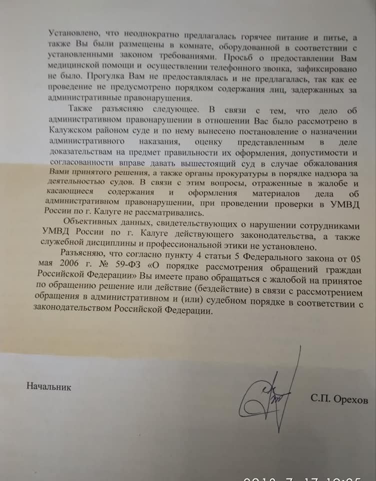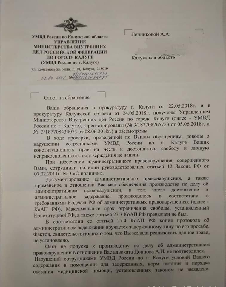 В Управлении МВД по г. Калуга не нашли нарушений при задержании участников акции 5 мая. Об этом ОВД-Инфо рассказала координатор штаба Навального в Калуге Анна Ленникова, которая подавала жалобу на действия полицейских.