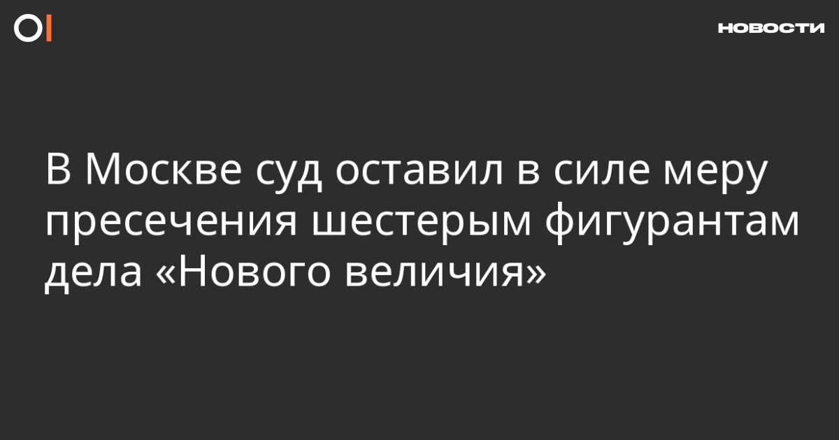 Дорогомиловский районный суд Москвы оставил в силе решение о домашнем аресте фигурантов дела «Нового величия» Анны Павликовой и Максима Рощина и решение о продлении срока содержания под стражей Руслана Костыленкова, Вячеслава Крюкова, Дмитрия Полетаев и Петра Карамзина. О решении по делу Павликовой и Рощина в фейсбуке написал общественный защитник Олег Еланчик. О решении по делам четверых других обвиняемых ОВД-Инфо сообщила сотрудница Международного «Мемориала» Екатерина Павленко.